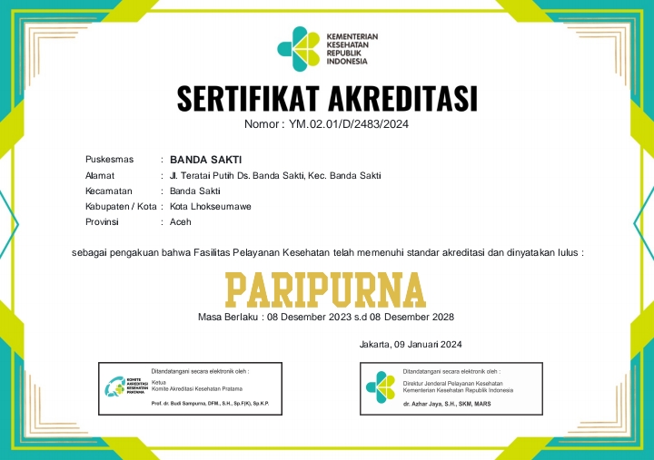 Sertifikat Akreditasi 03-11-2025 12:04:40 Berikut adalah hasil akreditasi UPTD Puskesmas Banda Sakti yang berlaku dari 08 Desember 2023 s/d 08 Desember 2028